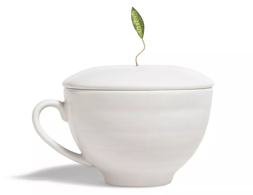 Tillsammans med Tea Fortés vackra kopp i vitt porslin med lock kommer de underbara teerna till sin rätt. Det tillhörande locket låter teet bryggas i önskad temperatur samtidigt som det vackra lövet sätter sin prägel på ceremonin.